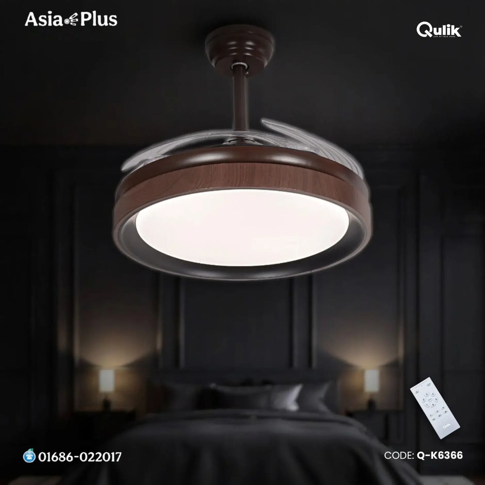 Qulik 48″ Modern Chandelier Retractable Invisible Blade Silent 3 Color Change LED Remote Ceiling Fan (Wooden) | Q-K6366
