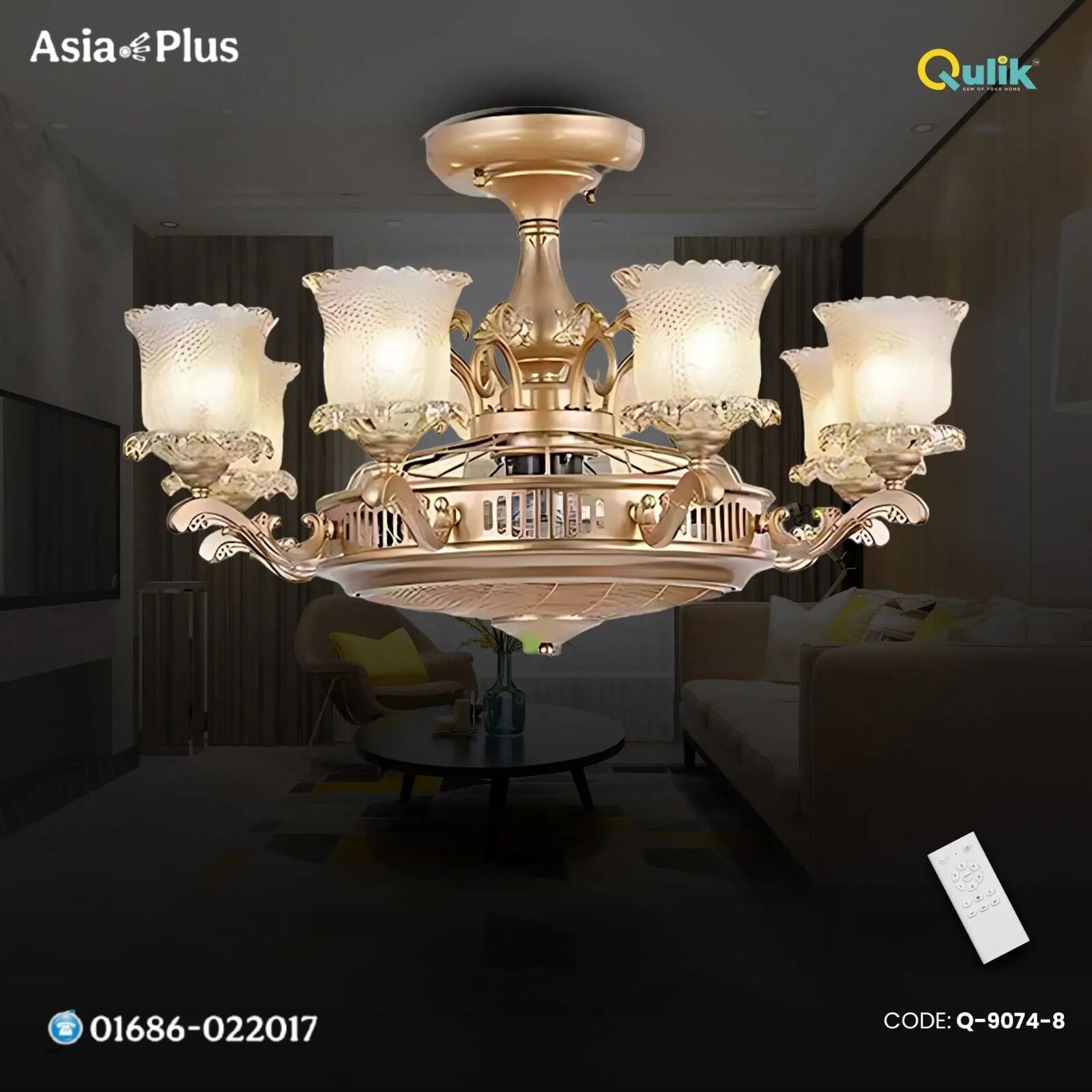 Qulik M07 48 Inch Modern Chandelier Retractable Invisible Blade Silent 3 Color Change LED Remote Ceiling Fan (Golden) Q-9074-8