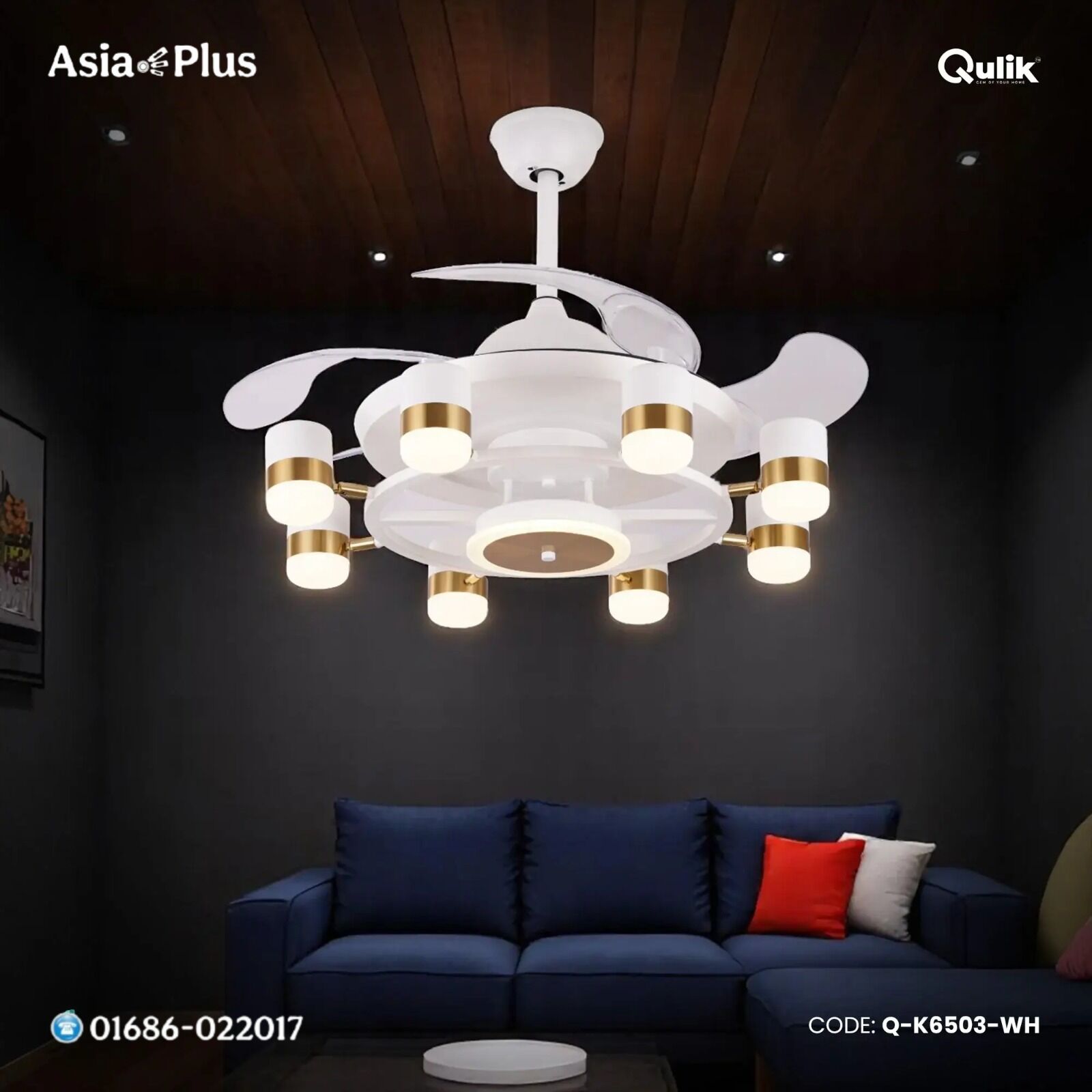 Qulik 48″ Modern Chandelier Retractable Invisible Blade Silent 3 Color Change LED Remote Ceiling Fan (White) | Q-K6503-WH